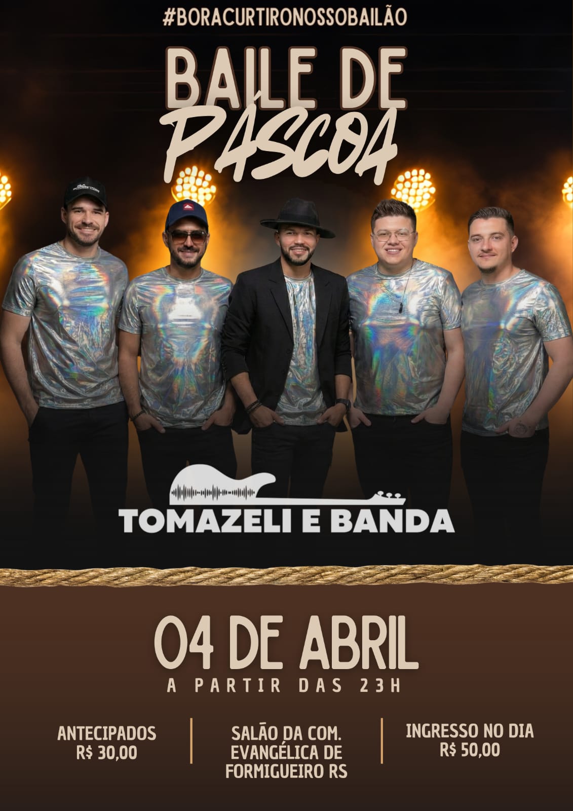 Vem aí o BAILE DE PÁSCOA! Dia 04 de abril, a partir das 23h, no Salão da Comunidade Evangélica de Formigueiro/RS Show com Tomazeli e Banda Uma noite especial pra dançar, reencontrar os amigos e curtir muita música boa! Antecipados: R$ 30,00 No dia: R$ 50,00 Marca a galera e já garante o teu ingresso! CLIQUE E VEJA MAIS!!